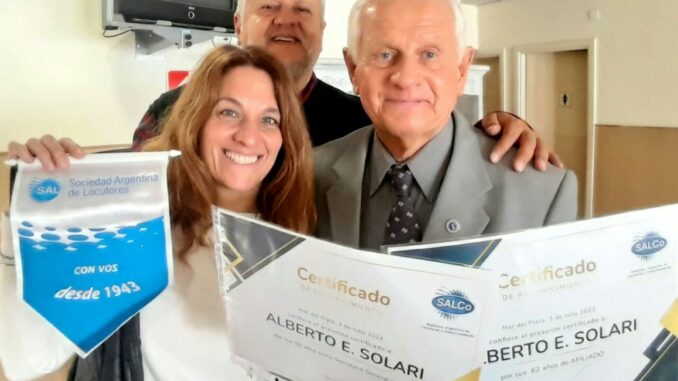 El sábado pasado 24 de septiembre la nueva junta directiva de la sociedad argentina de locutores seccional Mar del Plata hizo entrega de dos distinciones al locutor Alberto Solari, una por sus 62 años de afiliado y otra por sus 50 años de trayectoria como secretario general de S.A.L Mar del Plata.