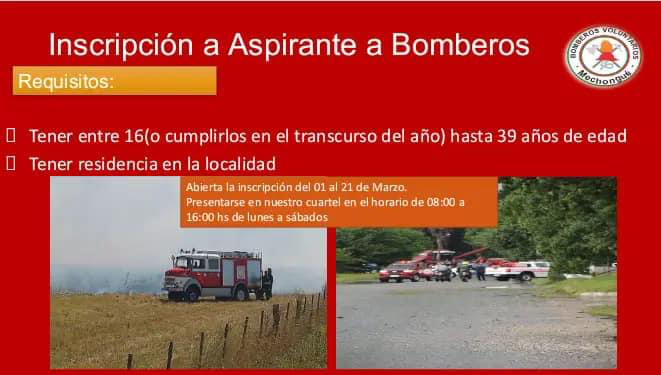 Requisitos: Tener entre 16 (o cumplirlos en el transcurso del año) hasta 39 años de edad. Tener residencia en la localidad. Presentarse en nuestro cuartel en el horario de 08:00 a 16:00 de lunes a sábados. Tenés tiempo hasta el 21 de Marzo