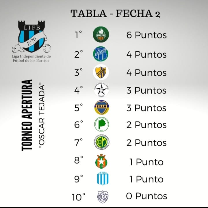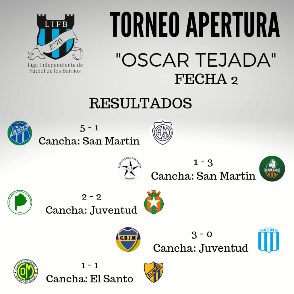 La liga independiente de los barrios jugó su segunda fecha y el líder es Ferrocarril de Miramar. Leganó por 3 a 1 a San Martin con goles de Diego Rocha, Agustín Schwencke y Jesús Arévalo. Viene de ser campeón y ahora tiene puntaje ideal.