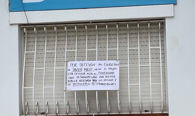 Reza el cartel ubicado en el frente del inmueble ubicado en calle 36 y 25 que dejara de funcionar el Centro de Acceso a la Justicia que dependía del Ministerio de Justicia de la Nación por decisión del Gobierno actual, por lo que 6 trabajadores quedaron sin trabajo.