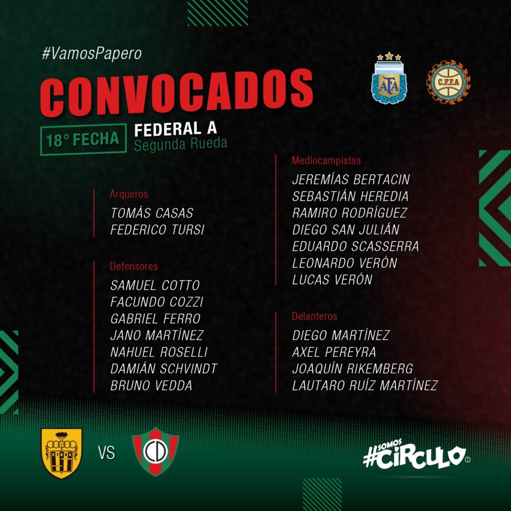 Luego del buen empate frente a Villa Mitre en el «Guillermo Trama», Círculo tiene otra dura prueba en Tandil ante Santamarina, por la 18va fecha de la Zona 1 del Torneo Federal A. En la delegación de 20 futbolistas que viajan a la ciudad serrana habrá una sola modificación respecto a los del domingo, porque Joaquín Bassani llegó a las 5 amarillas y se suma Jano Martínez, en su primera convocatoria.