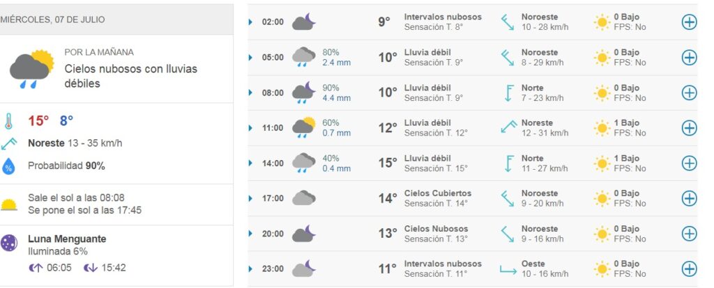 Hoy en Miramar y zona, cielos nubosos con lluvias débiles esta mañana, con temperaturas alrededor de 11°C.