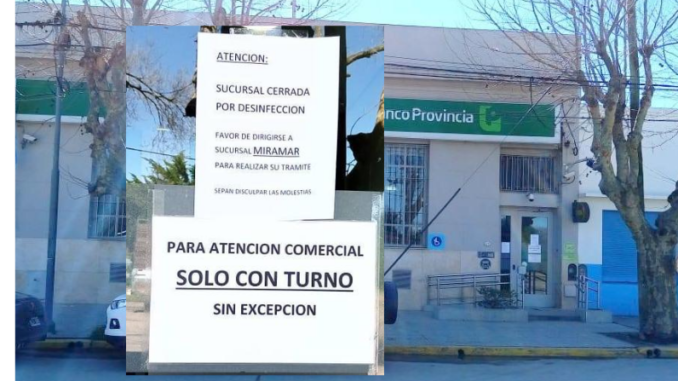 La sucursal del Banco Provincia de Otamendi estará cerrada por un tiempo debido a un posible caso positivo de un empleado oriundo de Mar del Plata. Los que deban hacer tramites tendrán que dirigirse a Miramar pero la consulta de los vecinos es ¿Cómo lo hacen? No hay medios de transportes públicos, un remis cobra fortuna. Se esperan soluciones en los próximos días para este tema.