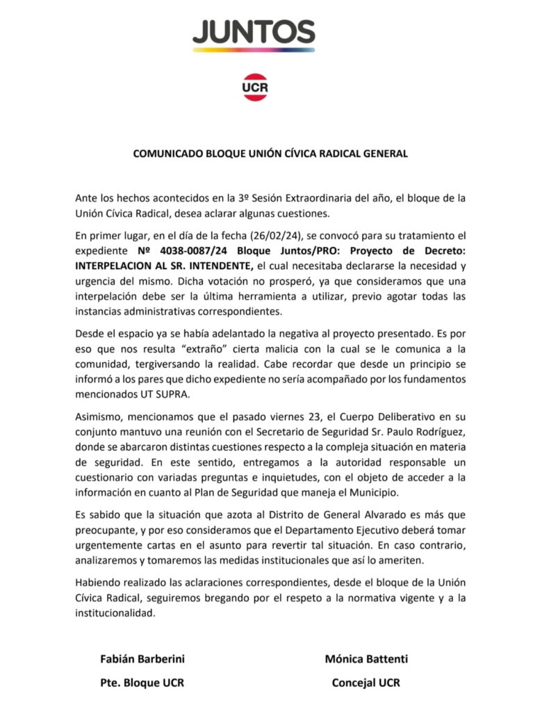 COMUNICADO BLOQUE UNIÓN CÍVICA RADICAL GENERAL ALVRADO