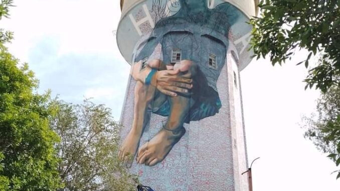 Como la comunidad conoce en el Tanque de Obras Sanitarias, histórico y desde que pertenecía la prestación del servicio a la Provincia de Buenos Aires se está realizando una intervención artística.
