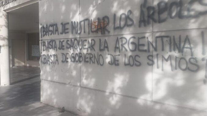 El día miércoles 12 de octubre se pudo observar en la entrada del Concejo Deliberante de Gral. Alvarado una inscripción realizada con pintura negra que dañaba todo el frente del mismo con manifestaciones hostiles y en queja por la mutilación de árboles.