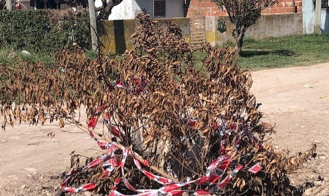 La foto ilustra la demarcación frente al peligro que realizan quienes tienen a su cargo el mantenimiento y cuidado de las calles. Unas ramas secas y una cinta es lo que sirve para ello.