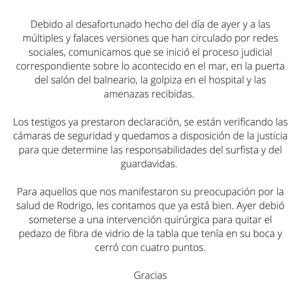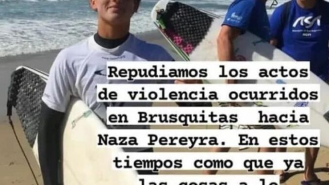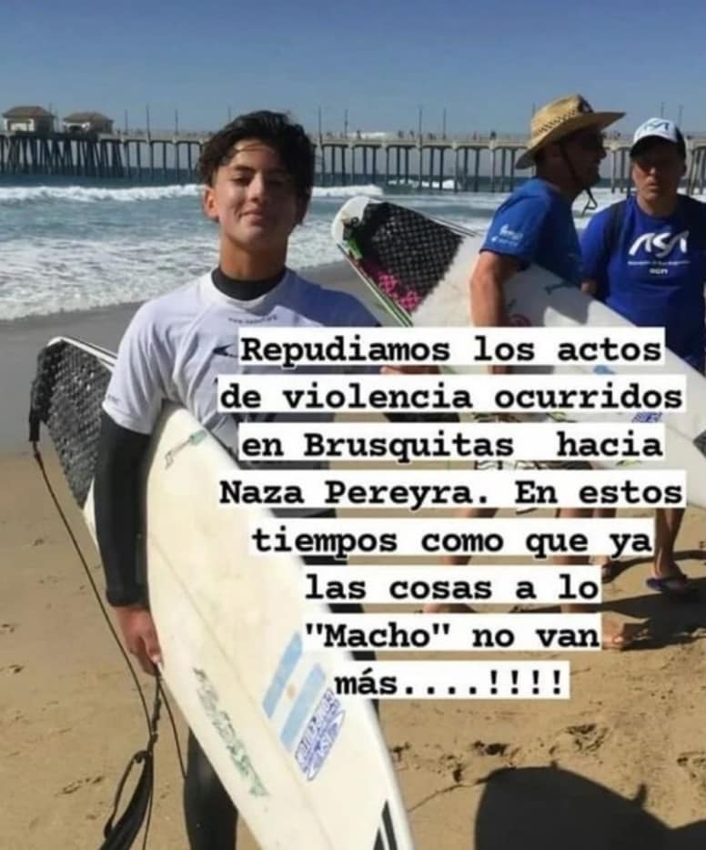 «El mismo dueño del balneario Las brusquitas de Miramar que hoy le rompió la tabla a Nazareno Pereyra la semana pasada nos echó de la playa de manera muy agresiva por que venía una tormenta mientras nosotros guardábamos nuestras pertenencias para dejar la misma ante el primer llamado … nos insultaba a mí y a mis hijos , no pasó a mayores por que nos fuimos y no le dimos bola pero hace rato habíamos dejado de ir a este lugar que amamos , por este mismo impresentable que siempre tiene problemas con alguien … vimos una vez cómo no dejaba bajar a una chica con su bicicleta la insultaba y mucho más maltrato hacia la gente … nos solidarizamos con este surfista a quien le rompieron toda la tabla mientras entrenaba hoy a la mañana»