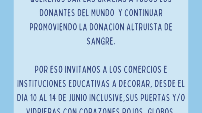 Invitamos a los comercios e instituciones educativas a decorar, desde el 10 al 14 de Junio inclusive, sus puertas y/o vidrieras con corazones rojos, globos, carteles alusivos, luces o lo que se les ocurra para conmemorar el Día Mundial del Donante de Sangre.