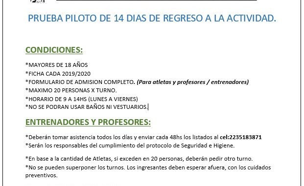 Después de un lunes intenso donde se habilitaron las actividades para gimnasios y natatorios en la ciudad de Mar del Plata en el estilo de «prueba piloto», la Federación Marplatense de Atletismo (FMA) informó que también hará una prueba bajo la misma modalidad.