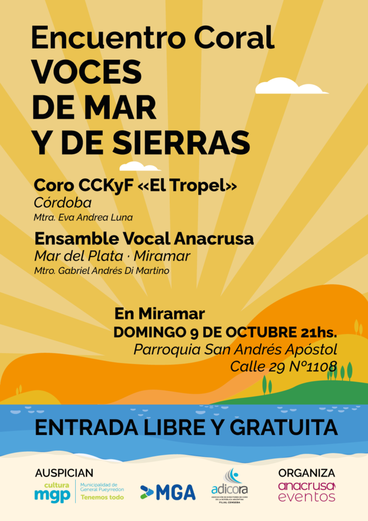 El próximo sábado 8 y domingo 9 de octubre se llevará a cabo el encuentro de coros en el cual participarán el Coro del Colegio de Kinesiólogos y Fisioterapeutas de Córdoba “El Tropel”, dirigido por la Mtra. Eva Andrea Luna y el Ensamble Vocal Anacrusa dirigido por el Mtro. Gabriel Di Martino, de la ciudad de Miramar.