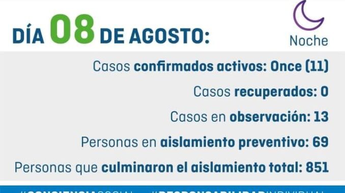 Hay 11 casos confirmados de coronavirus y hay 13 casos en observación: 10 casos con origen en el día de hoy y 3 casos que continúan del día de ayer 07/08.
