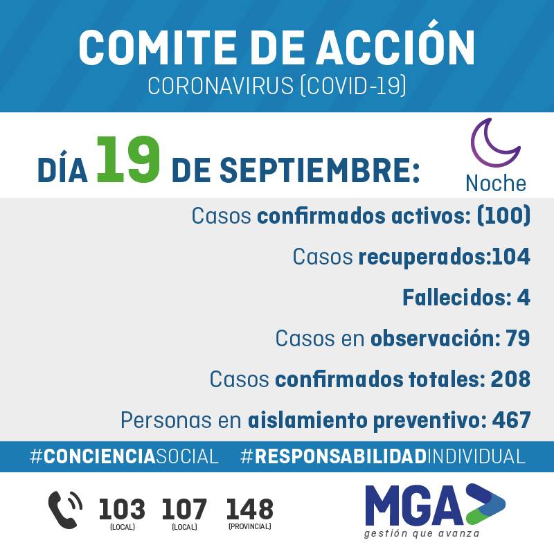 Hay 79 casos en observación: hay 10 casos con origen en el día de ayer, 17 casos con origen el día 18/09, 4 casos con origen el día 17/07 ,6 casos del día 16/09, 12 casos con origen el día 15/09, 18 casos con origen el día 14/09, 1 casos con origen en el día 13/09, 11 casos con origen en el día 11/09.