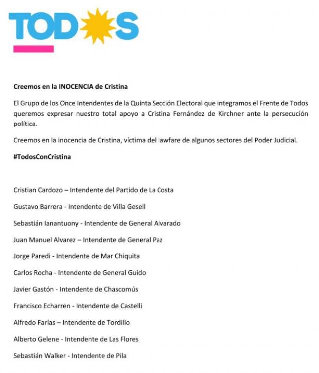 El Grupo de los Once Intendentes de la Quinta Sección Electoral que integran el Frente de Todos, entre ellos Sebastián Ianantuony de General Alvarado, a través de la red social Twitter, expresó «el total apoyo a Cristina Fernández de Kirchner ante la persecución política».