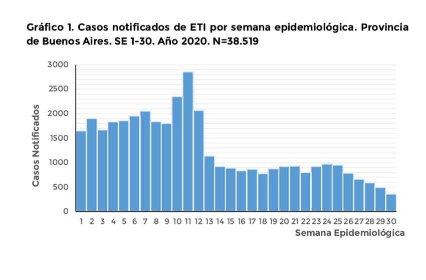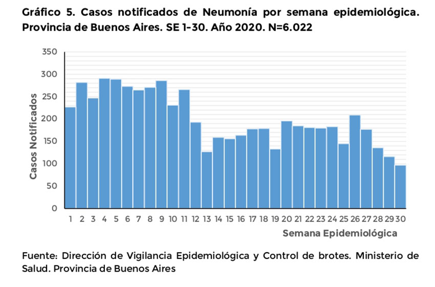 Según los datos publicados por el Ministerio de Salud bonaerense, hasta la semana 29 del año «se registraron un total de 54.184 casos de infecciones respiratorias agudas (en todos sus eventos), lo que representa una disminución del 64% en la notificación respecto del mismo período en el año 2019″.