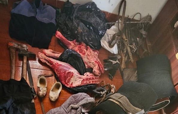 Allí los policías secuestraron elementos de corte y utilizados para la faena, lazos y prendas con manchas hemáticas, tijera de cortar alambre, municiones calibre 22, además de dos cuartos y paleta vacunos.