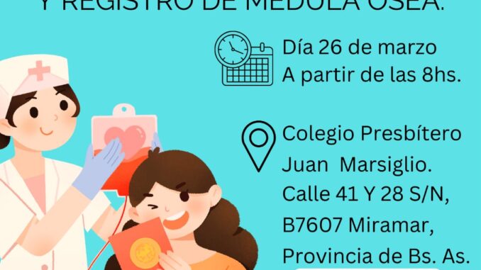 El Colegio Parroquial “Pbro. Juan Marsiglio”, junto al Servicio de Hemoterapia del Hospital Municipal “Dr. Marino Cassano, y el Grupo “Las Meduleras” de Miramar, llevarán adelante el martes 26 de Marzo, desde las 08:00 hs., una nueva Colecta de Sangre y Registro de Médula Ósea, en la sede del Colegio (calle 41 y 28, Miramar).