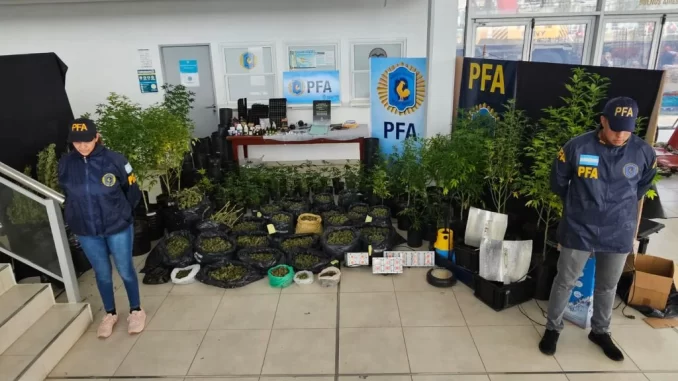 Un hombre fue detenido. En el operativo, la Policía Federal secuestró bolsas de plástico con 21 kilos de marihuana en cogollos, más de 100 plantas, 300 plantines, fumigadores químicos, lámparas especiales, elementos de ventilación y acondicionamiento de ambientes y de laboratorio, frascos de cremas y goteros de aceite de cannabis, pendrives, teléfonos celulares, una computadora, un vehículo importado y documentación de interés.