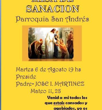 Misa de Sanación en Parroquia San Andrés 2 agosto, 2019 Locales Este próximo martes 6 de agosto, a las 19: 00hs se oficiará una Misa de Sanación celebrada por el Padre José Martínez, se invita a toda la comunidad a participar.