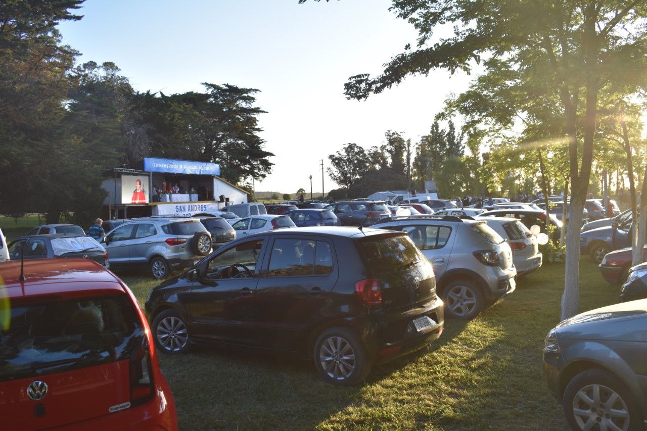 Con una pantalla gigante y el escenario convertido en altar se desarrolló la misa, con los participantes en sus vehículos. A través de Radio Zona se podía sintonizar la transmisión de la Misa, tipo autocine.