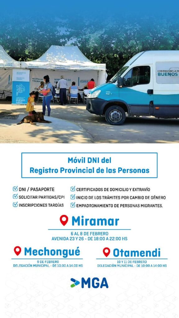 El Registro Provincial de las Personas estará en los días lunes 06 al miércoles 08 de Febrero en Miramar (Av. 26 y 28, de 18:00 a 22:00 hs.); en Mechongué el jueves 09 de Febrero, de 10:00 a 14:00 hs. (Delegación Municipal); y en Cte. Nicanor Otamendi, los días viernes 10 y sábado 11 de Febrero, en el horario de 10:00 a 14:00 hs. (Delegación Municipal).
