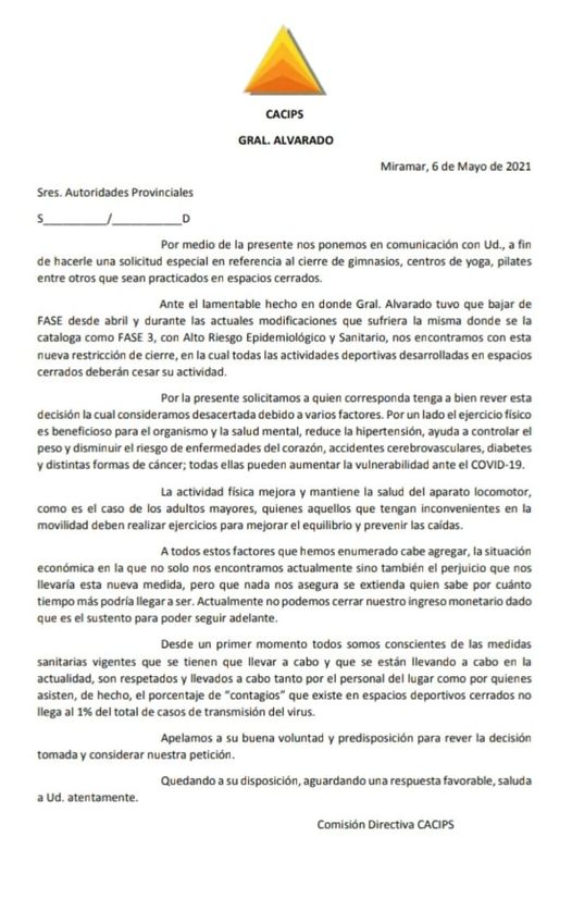 La Cámara de Comercio, Industria, Producción y Servicios de General Alvarado (Cacips) elevó un comunicado ante la Federación Económica de la Provincia de Buenos Aires (Feba) para que se revea la medida del cierre de gimnasios y espacios deportivos cubiertos, según marca el protocolo sanitario de la fase 3 del esquema epidemiológico bonaerense.