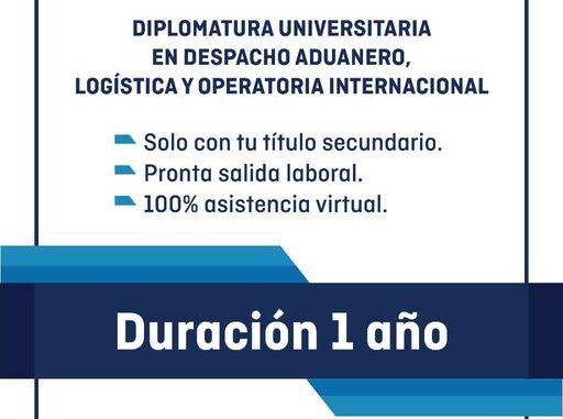 La Diplomatura Universitaria en Despacho Aduanero, Logística y Operatoria Internacional dura 1 año, su asistencia es virtual 100%, y posee una importante demanda laboral entre las Empresas de Comercio Internacional, colaborando además formalmente en Estudios de Despachantes de Aduana, o para desarrollar un emprendimiento propio en comercio Internacional.