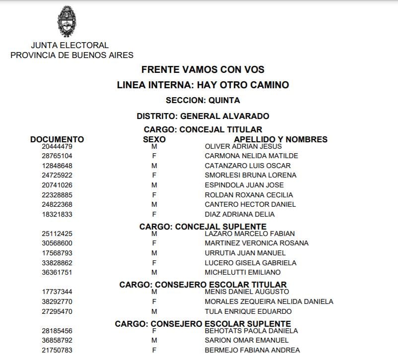 La Junta Electoral de la Provincia de Buenos Aires publicó cuáles serán las listas que participarán de las Elecciones de este domingo 12 de septiembre en General Alvarado.
