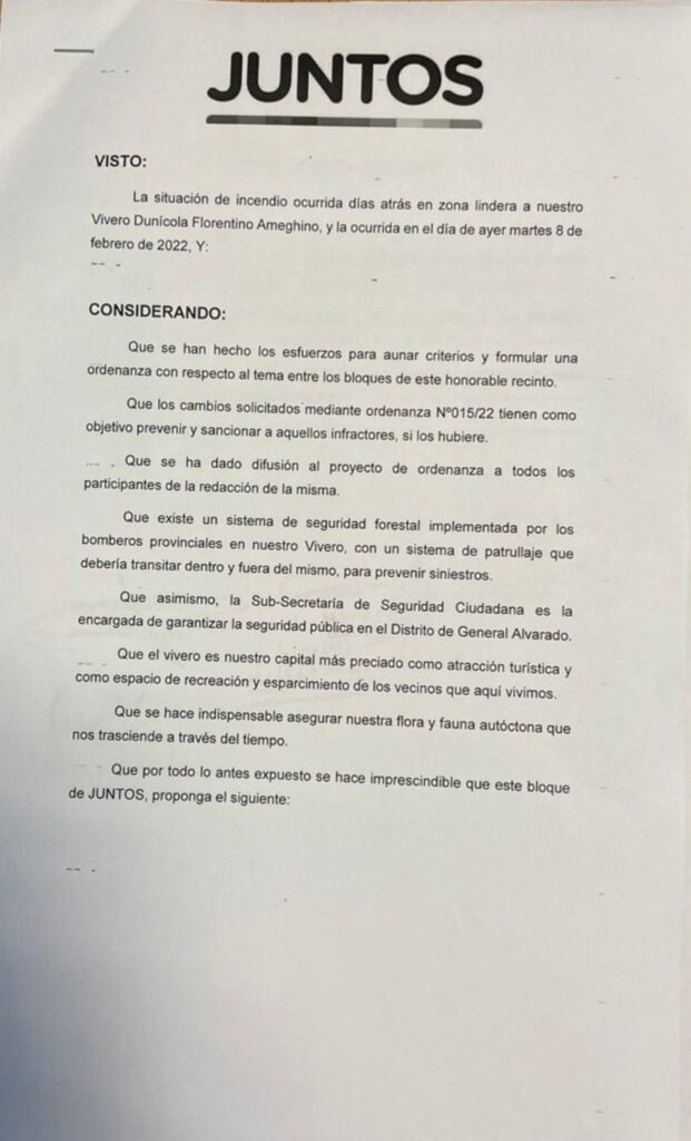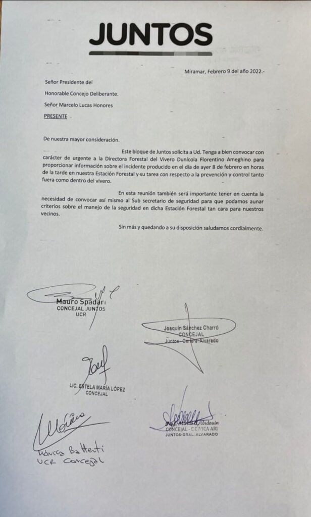 A raíz de un nuevo incendio ocurrido en el día de ayer, el Bloque Juntos solicitó de CARÁCTER URGENTE que la Directora Forestal y el Subsecretario de Seguridad bajen al recinto para dar explicaciones sobre el control y el cuidado del vivero.