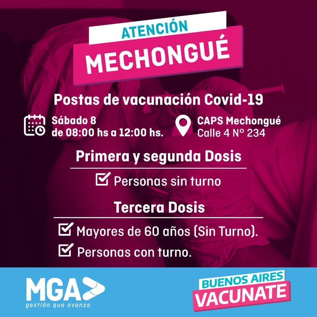 Tras el pedido de los concejales de «Juntos», el gobierno local dispuso que el sábado 8 de 08:00 a 12:00 hs. en el CAPS de la localidad de Mechongué (Calle 4 N°234) se habilitará la posta de vacunación covid-19.