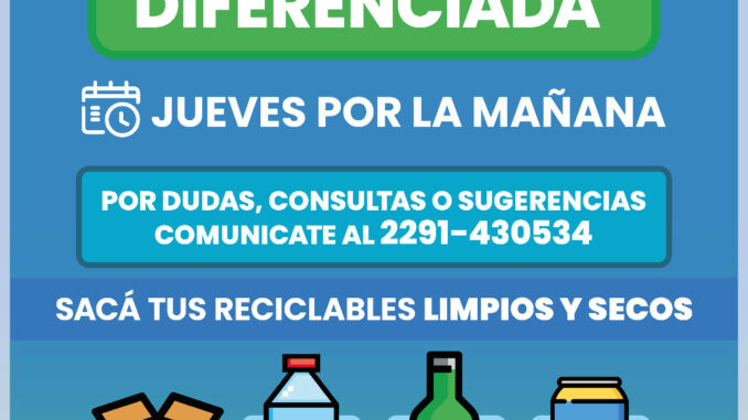 Recolección Diferenciada 22 mayo, 2024 Locales El jueves 23 de mayo comenzará a realizarse la recolección diferenciada, en los barrios de Las Lomas, Bristol y Copacabana situados en la ciudad de Miramar. Dicha recolección se efectuará todos los jueves en horario matutino.