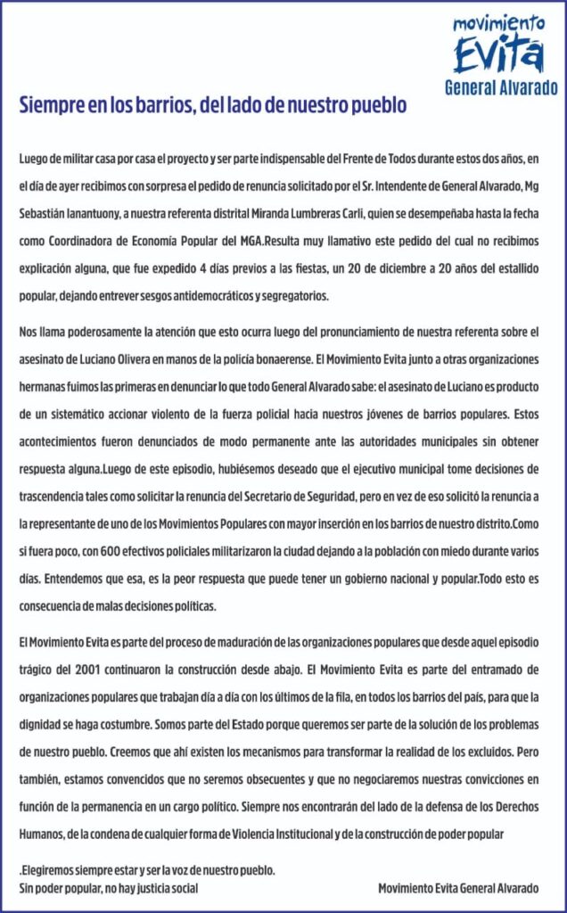 El Movimiento Evita junto a otras organizaciones hermanas fuimos las primeras en denunciar lo que todo General Alvarado sabe: el asesinato de Luciano es producto de un sistemático accionar violento de la fuerza policial hacia nuestros jóvenes de barrios populares. Estos acontecimientos fueron denunciados de modo permanente ante las autoridades municipales sin obtener respuesta alguna.