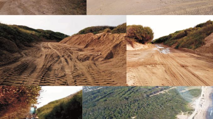 Nuevamente se está perpetrandoun verdadero crimen ecológicodentro de la Reserva Natural más importante que tiene nuestra ciudad y nuestro distrito. El Argentino pudo acceder a fuentes confiables quienes indicaron que el Municipio está realizando un extenso camino costero para que el turismo este próximo verano, pueda acceder con sus camionetas y cuatriciclos a las playas, que hasta el momento eran vírgenes, y así lo detallan las imágenes que hemos capturado en el lugar.Se puede ver a las claras, la triste imagen de una amplia de superficie, donde hasta hace pocas semanas existían médanos y dunas; desaparecieron literalmente. También pudimos observar varios camiones cargados con la arena extraída de los mismos, con destino incierto. Ya en el año 2012, Miembros de la Asamblea en Defensa del Vivero (Durante la gestión de Patricio Hogán)ya habían denunciado desde principios del año 2010, la tala indiscriminada de árboles en ese lugar, la desaparición de dunas y la construcción de las famosas “Cabañas” dentro del complejo Frontera Sur. Finalmente en el año 2017 luego de una larga lucha judicial, la Asamblea en Defensa del Vivero logró ganar el juicio que tenían contra el municipio de Gral. Alvarado,cuando el Juez Federal Santiago J. Martín dicto sentencia y ordenó la suspensión de las obras debido a las graves irregularidades que presentaban las mismas. Pero aún hoy, después de dos años las edificaciones siguen en pie y nos encontramos con un parador que funciona como balneario, restaurante y boliche nocturno.