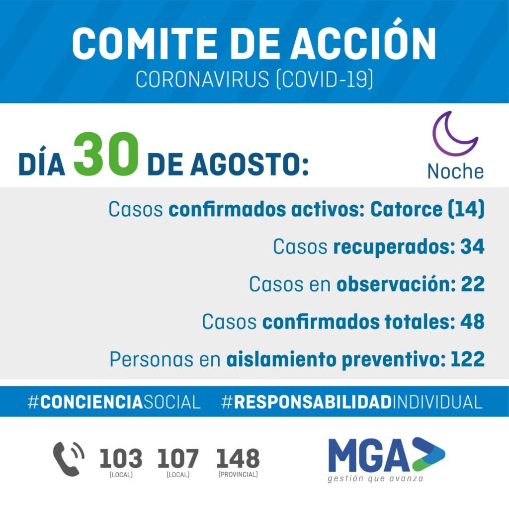 El último parte nocturno de Covid-19 en General Alvarado mostró 14 casos confirmados activos de coronavirus y un nuevo caso recuperado. La nota sobresaliente son los 22 casos en observación: 5 casos con origen en el día de ayer, 4 casos con origen en el día 29/08, 3 casos con origen en el día 28/08, 10 casos con origen en el día 27/08. Esta semana desde el INE estarán enviando los resultados.