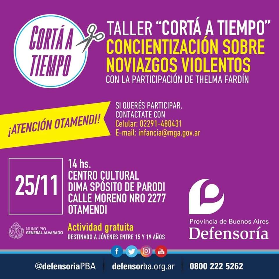El próximo lunes 25 de noviembre en Otamendi, en el centro cultural Dima Spósito de Parodi (Moreno N°2277) desde las 14hs, la defensoría del pueblo de la provincia de Buenos Aires organizó el taller “Cortá a Tiempo” concientización sobre noviazgos violentos con la participación de Thelma Fardín.