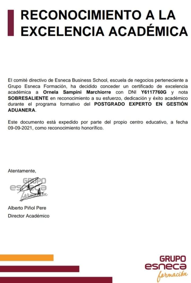 Ornela Sampini Marchiorre, miramarense que reside en España recibió este reconocimiento a la excelencia académica en ESneca Bussines School, una escuela de negocios le otorgó la nota sobresaliente por su esfuerzo, dedicación y esfuerzo académico durante el programa formativo del postgrado experto en gestión aduanera.
