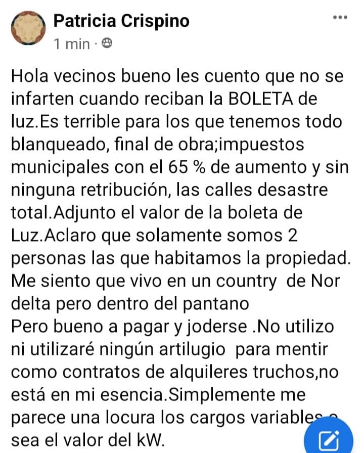 En las redes sociales se viralizo una queja de vecina por el aumento de la energía eléctrica y que incluye el pago de la ley 10740. Nuevamente los ciudadanos de esa localidad plantean sus reclamos por la falta de servicios y el altísimo costo de las tasas. así se expresó: