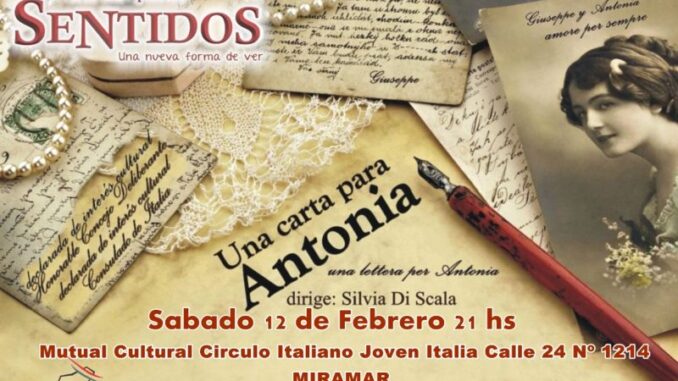 El, dia 12 de febrero la Asociacion Cultural Circulo Italiano Joven Italia anuncia nuevamente la obra “Una Carta para Antonia” bajo la direccion de Silvia Di Scala y a partir de las 21 hs. en su sede social de calle 21 y 24.